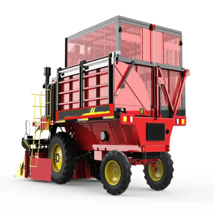 The harvester is built with durable construction materials designed for long-lasting use in harsh agricultural environments.