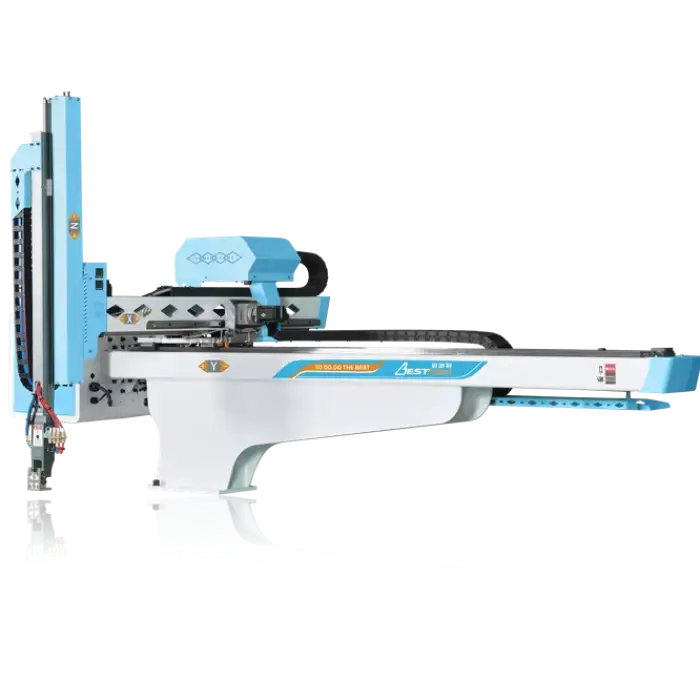 The robot enhances productivity through high-speed operations and energy savings, making it ideal for efficient injection molding processes.