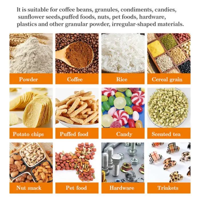 The machine is designed to handle various materials including grains, salt, sugar, rice, and other granules.