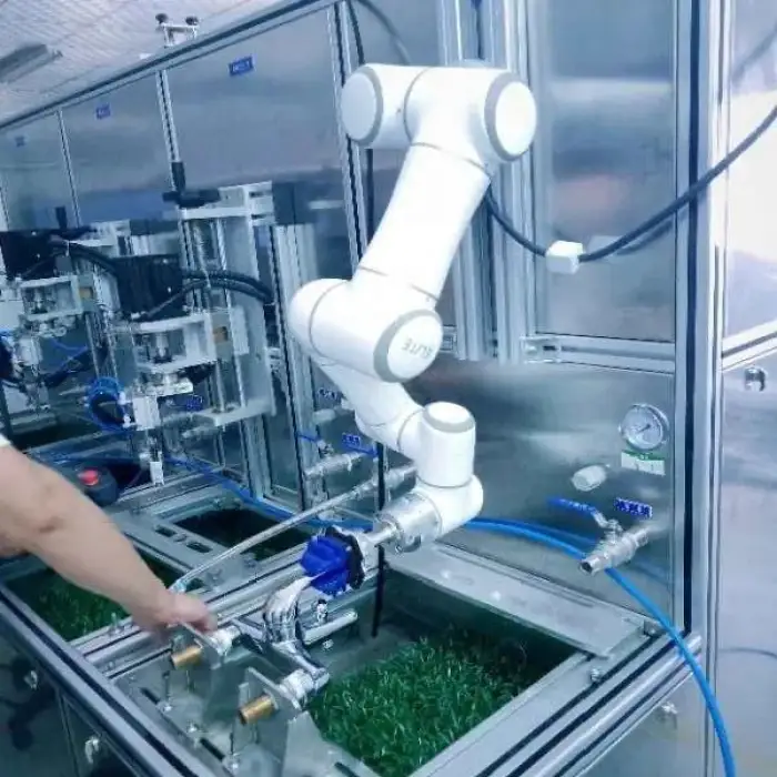 The robot comes equipped with a versatile gripper, which allows it to handle a variety of objects for different applications.