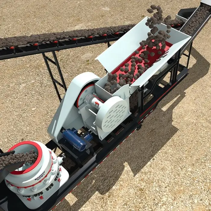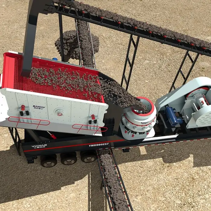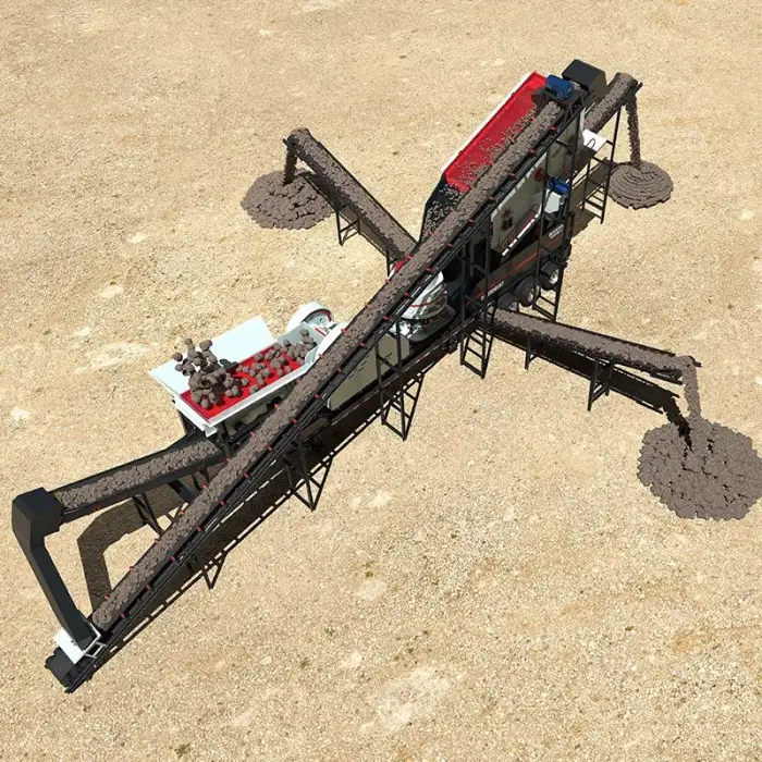 This mobile crusher includes a vibrating feeder, a jaw crusher, a cone crusher, and a vibrating screen, all integrated into one unit.