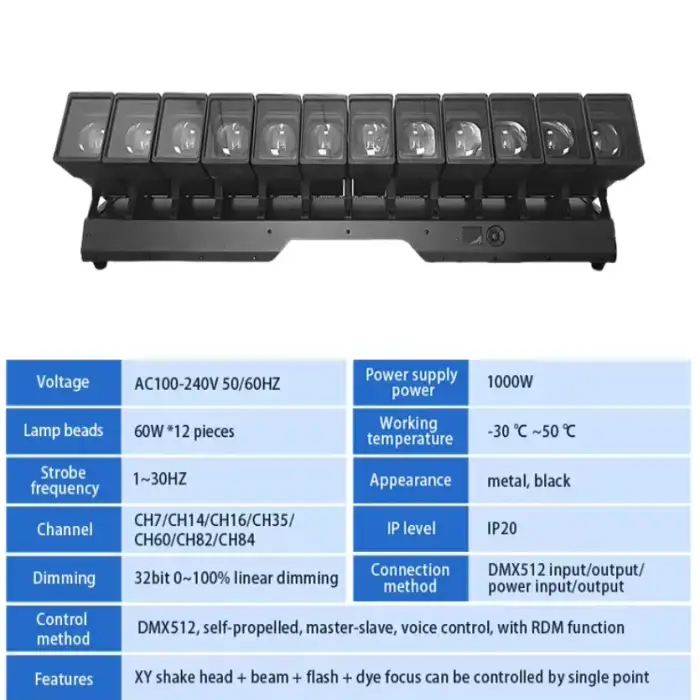 The light can be controlled via DMX512, self-propelled, master-slave, and voice control modes, with an RDM function for enhanced control.