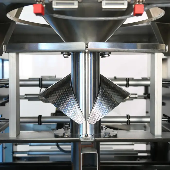 The packaging machine is equipped with 10 weighing heads for precise filling.