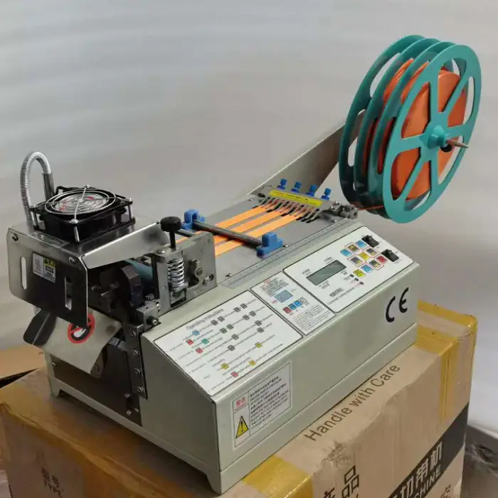 The machine is designed to cut various materials including fabric, leather, and different types of packaging materials.
