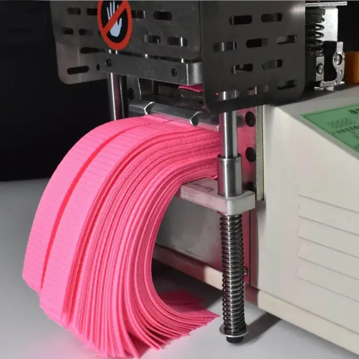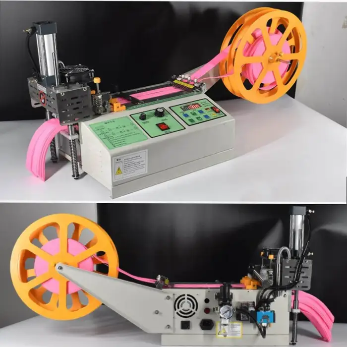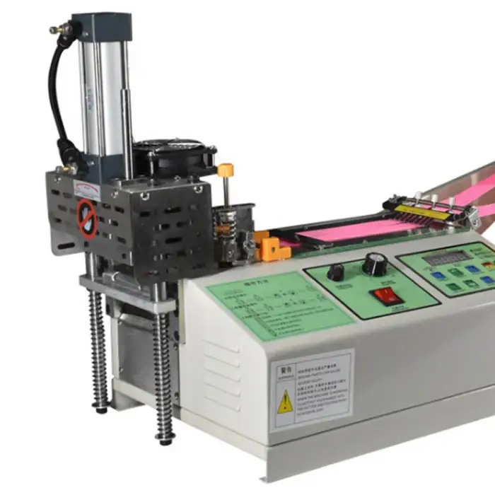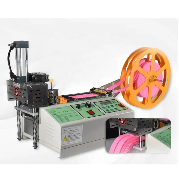 The machine can efficiently cut various materials including elastic bands, webbing, zippers, and more, making it suitable for multiple applications.