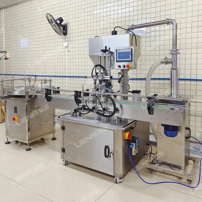 The machine uses a piston filling mechanism, which is ideal for high-viscosity products.