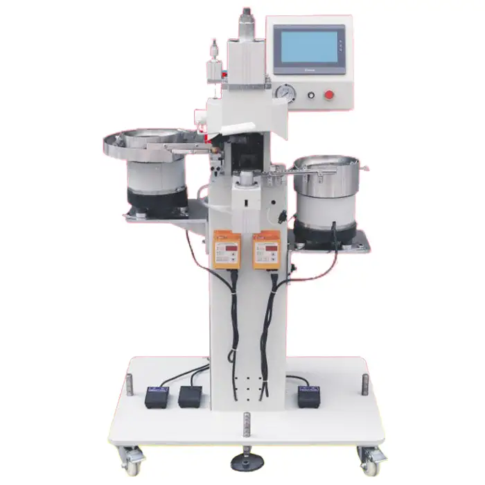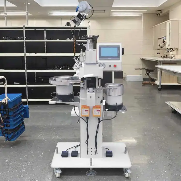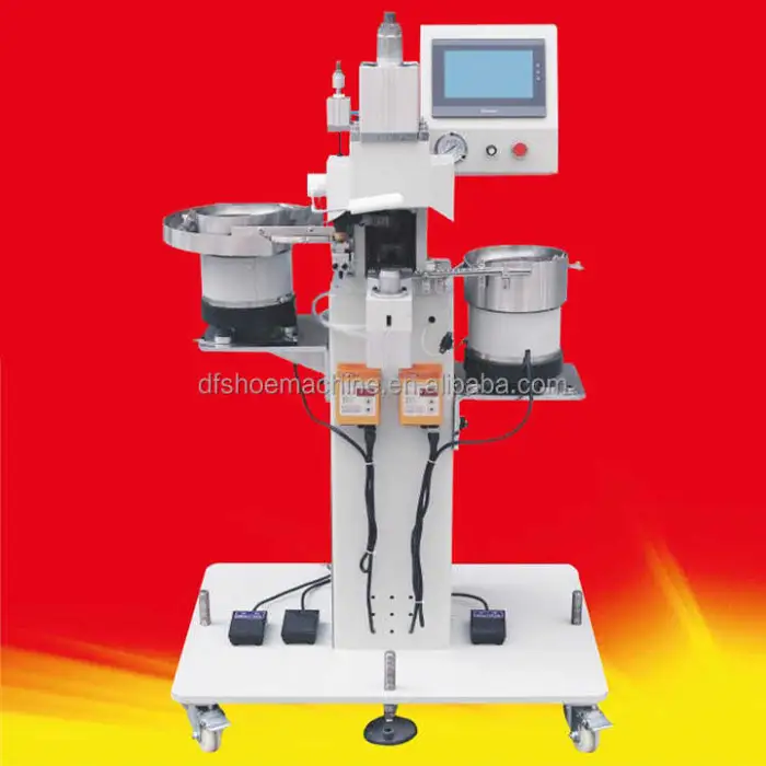 The machine is ideal for producing leather shoes and other types of footwear with eyeleting and riveting.