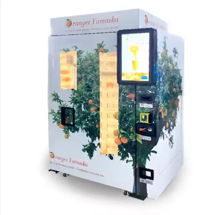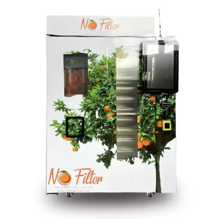 The Automatic Fresh Orange Juice Making Smart Vending Machine can hold up to 70 cups of juice.