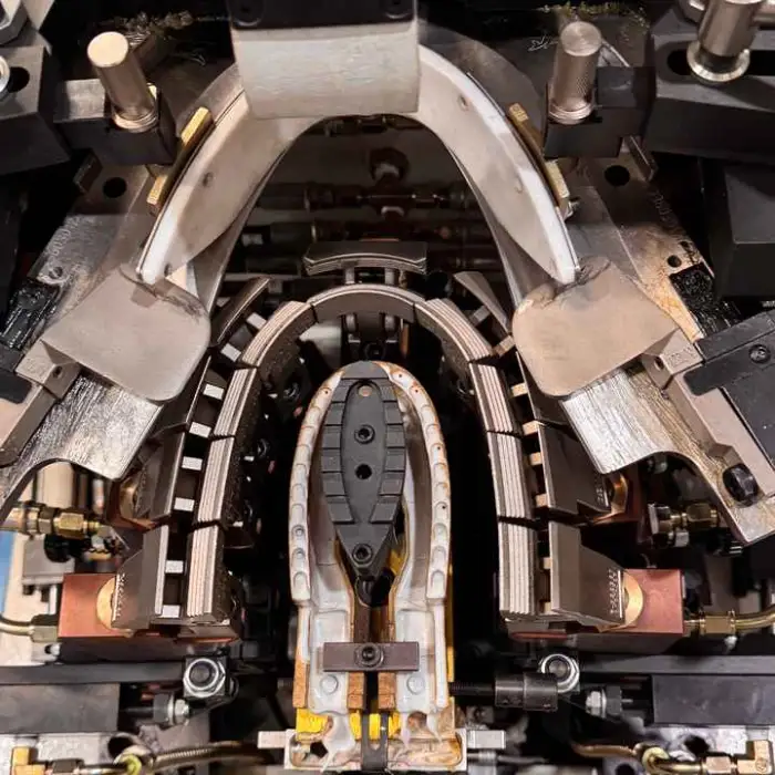 This is an Automatic Hydraulic Toe Lasting Machine (9 Pincers Automatic Shoe Toe Lasting Machine) used to automate the toe lasting process when making shoe uppers, improving consistency and production efficiency for small workshops and large factories.