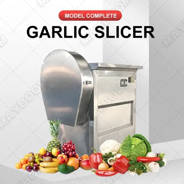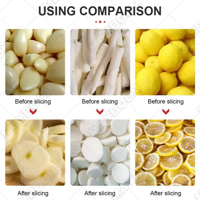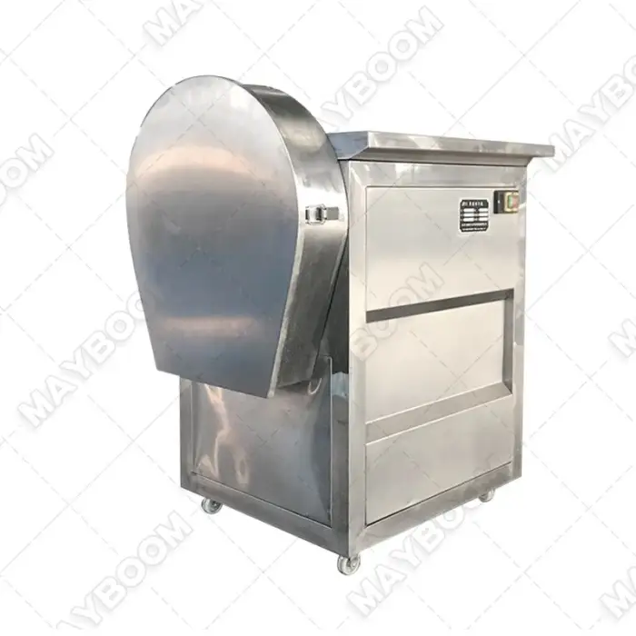 The machine is designed to cut potatoes, fruits, and vegetables into various shapes, making it ideal for potato chips, French fries, salads, and fruit platters.