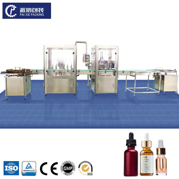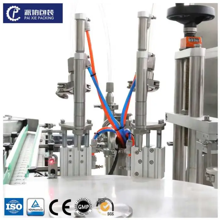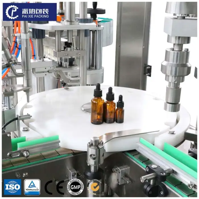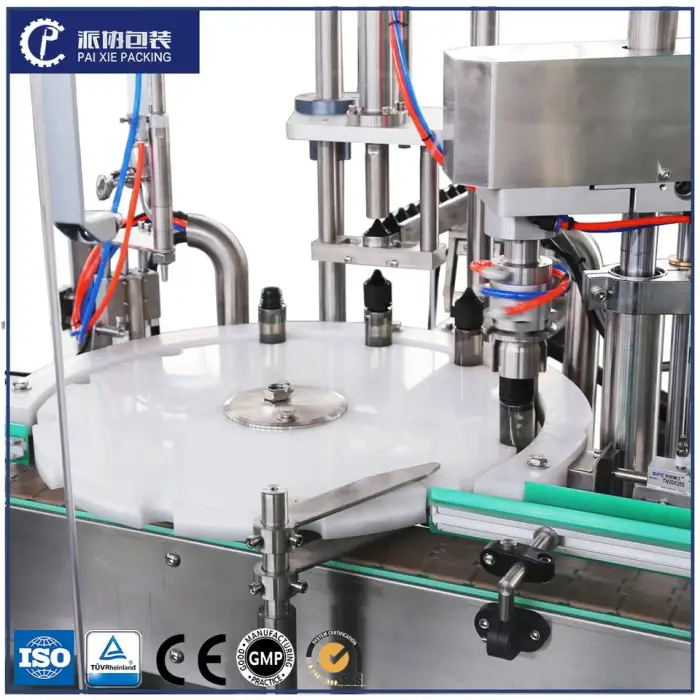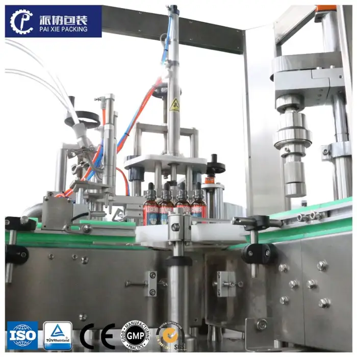 The machine is designed for high accuracy filling of liquids such as essential oils, juices, lotions, creams, sauces, and other liquid products.