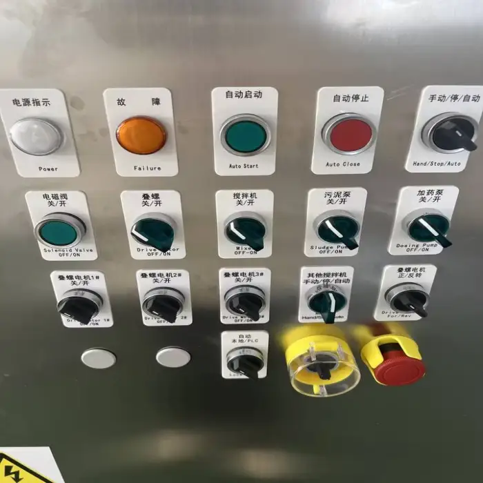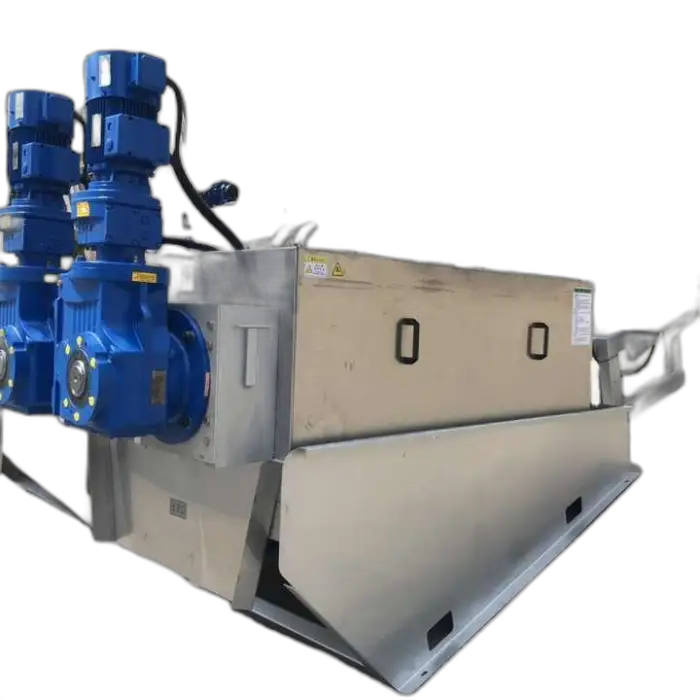 The machine requires electrical power for the motor(s), PLC control, and any auxiliary pumps. It may also require a conditioned water supply for washdown and a polymer dosing system (if used). Concrete or steel support capable of bearing the 2000 kg unit plus dynamic loads is recommended. Exact electrical ratings and utility needs are provided on the technical datasheet/nameplate.