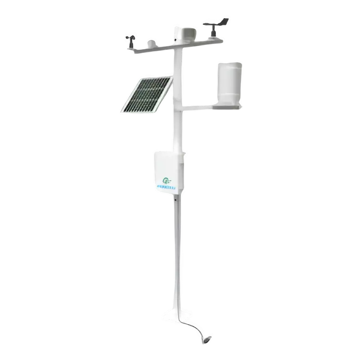 The FT-QC10 monitors a range of environmental parameters including ambient temperature, humidity, soil temperature, soil humidity, wind speed, wind direction, pressure, rainfall, illuminance, and global radiation.