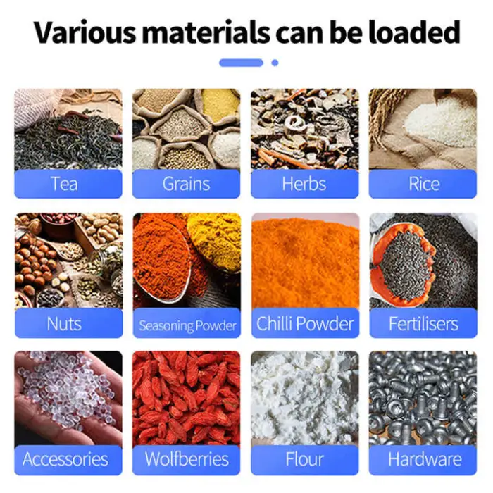 This machine is suitable for packaging a variety of products including food items like rice and snacks, as well as chemical products, hardware components, textiles, and tobacco.