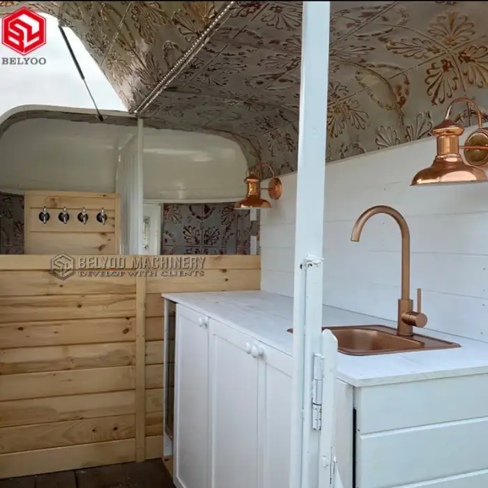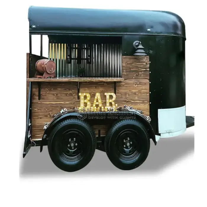 The trailer features a four-wheel setup that allows for easy transportation, making it ideal for food vendors on the move.