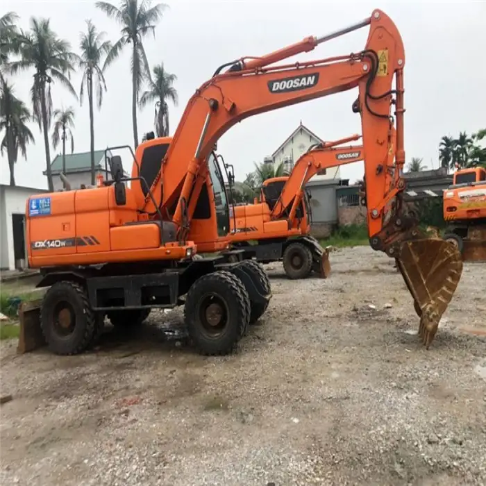Key features of the DX140W include a fully hydraulic system, compact design for easy maneuverability, and a powerful engine for efficient digging and lifting.