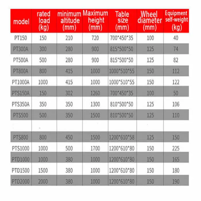 The lift table has a load capacity ranging from 150 to 3000 kg, making it suitable for various heavy lifting tasks.