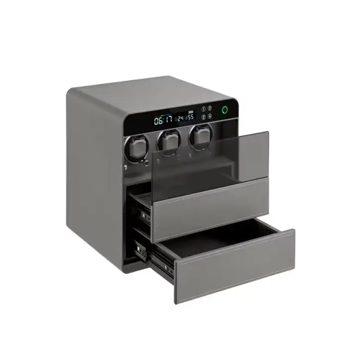The watch winder features a triple damper track slider type, which helps in smooth operation.
