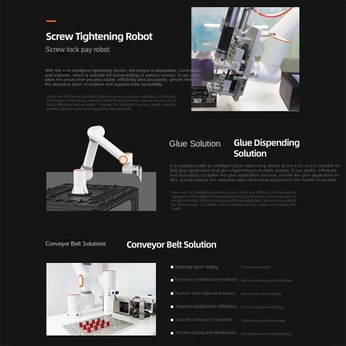 The robot is suitable for various industries, including automotive manufacturing, aerospace, warehousing, construction, and assembly lines.
