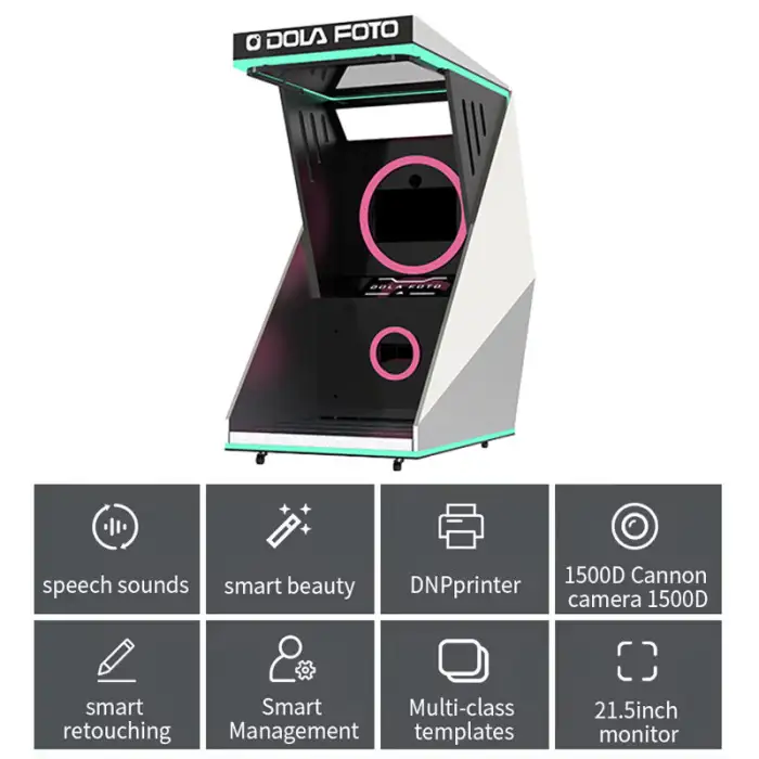 The kit includes a 21.5-inch 1080P touch screen, photo booth printer, camera, trendy props, and all necessary hardware for setup.
