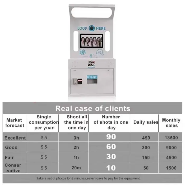 The photo booth supports multiple payment methods, including QR codes, banknotes, coins, and credit cards, making it convenient for guests.
