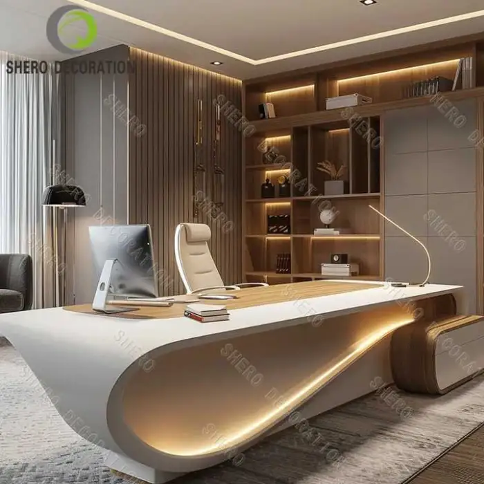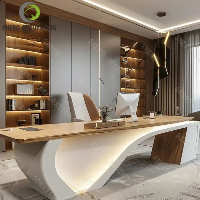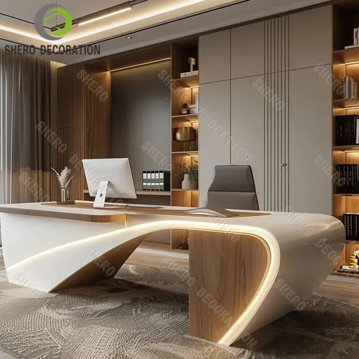 The desk is constructed from high-quality PLY, MDF, solid wood, tempered glass, acrylic, and stainless steel, ensuring durability and elegance.
