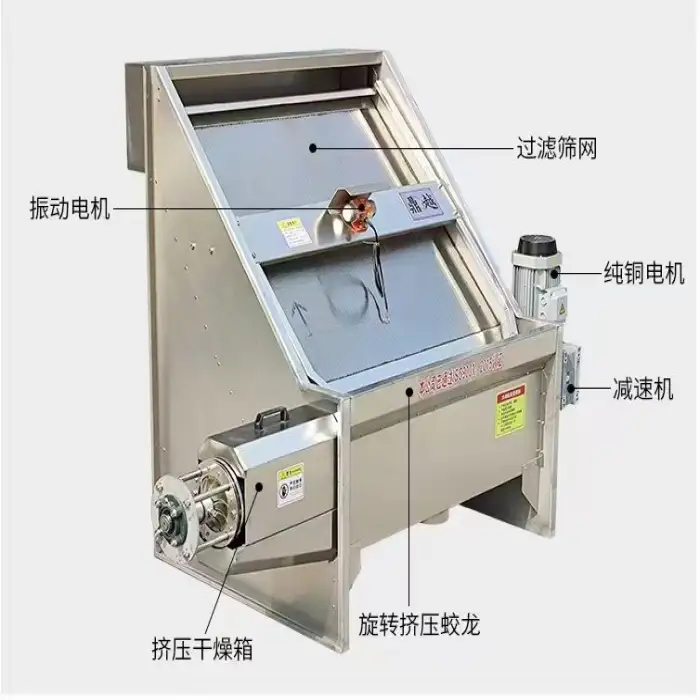 It is a mechanical dewatering system designed to separate liquid from solid waste such as cow manure and biogas slurry using a spiral axis (screw), a screen, and a vibrating unit to produce a drier solid fraction and clarified liquid.