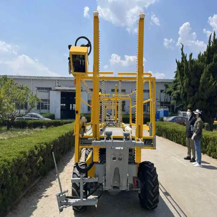 The self-propelled design allows the harvester to move easily within the orchard without requiring additional equipment.