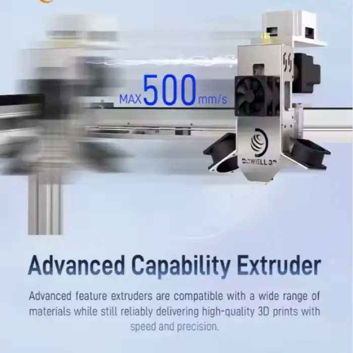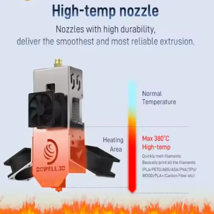 The Dowell 3D Printer can reach nozzle temperatures up to 420°C, allowing for the use of high-temperature materials.