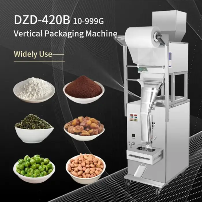 The DZD-420B machine is designed to package a variety of snacks, including popcorn, banana chips, French fries, and potato chips.