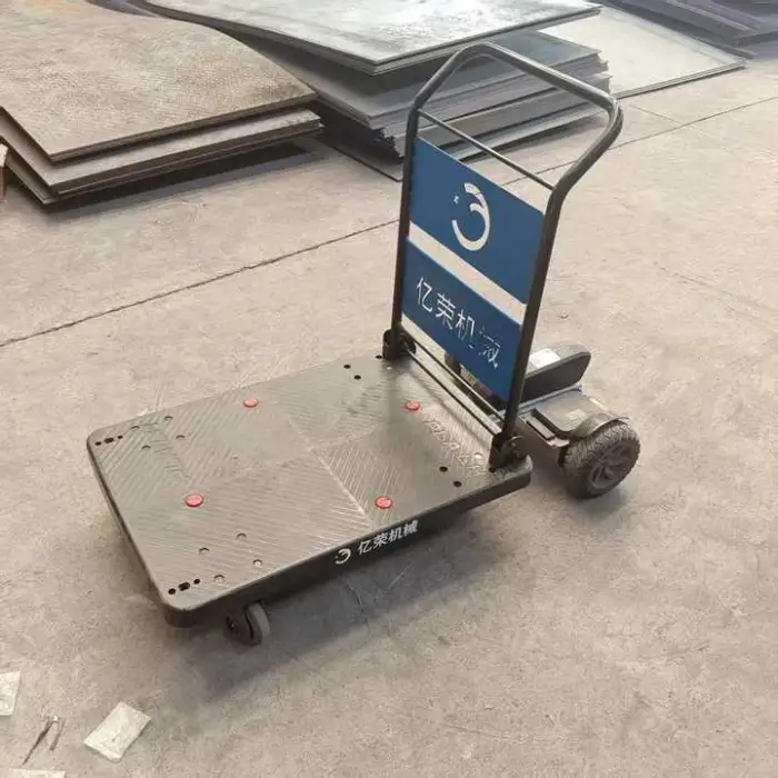 The vehicle is constructed from sturdy metal, ensuring durability and reliability during material handling tasks.