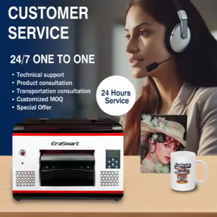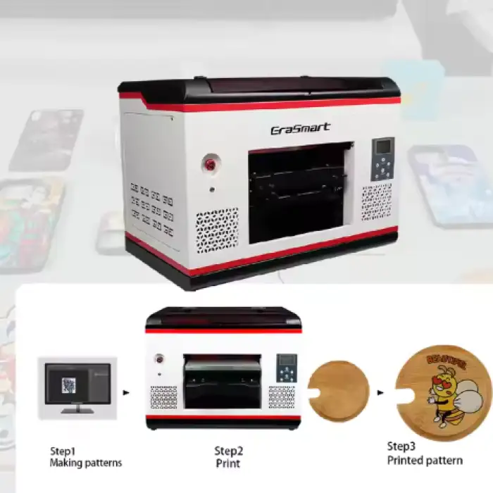 The printer can print on various materials including phone covers, cards, bottles, USB drives, and more.