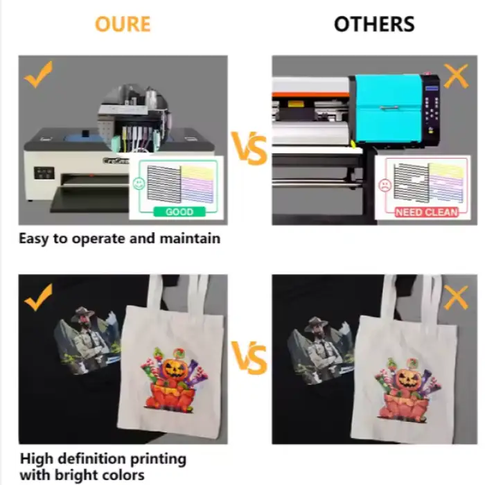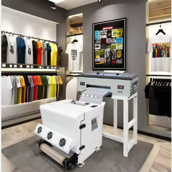 The printer uses PET film pigment ink, which ensures waterproof, durable prints that are ideal for garment customization.
