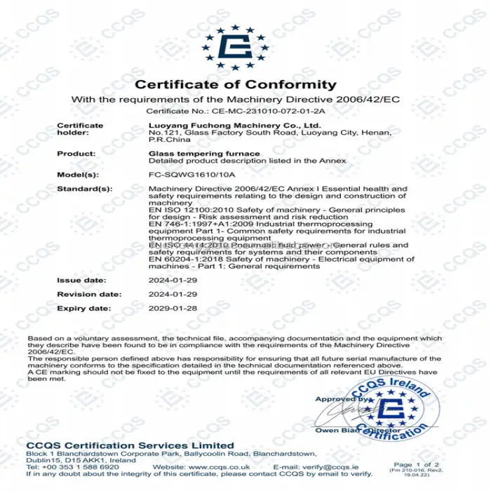 The FC-SSQPG uses forced convection heating for efficient glass tempering.