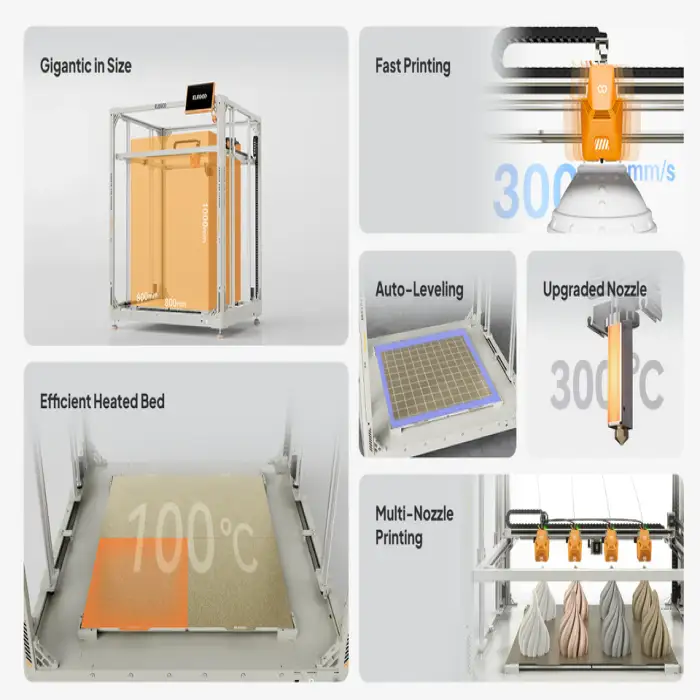 The build volume of the ELEGOO FDM Orange Storm Giga 3D Printer is 800mm x 800mm x 1000mm, allowing you to print large projects with ease.