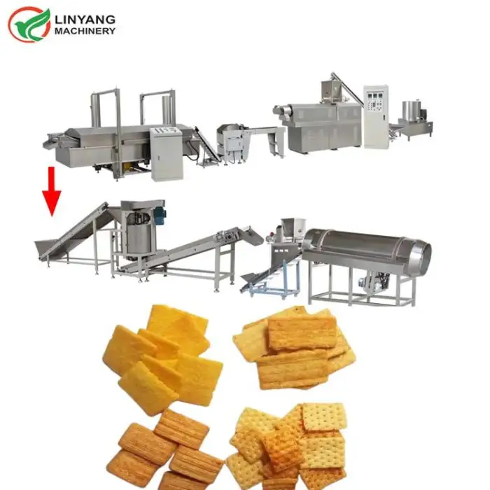 The Frying Machine for Snacks Manufacturing is designed to produce a variety of fried snacks, including rice crust chips and other snack foods.