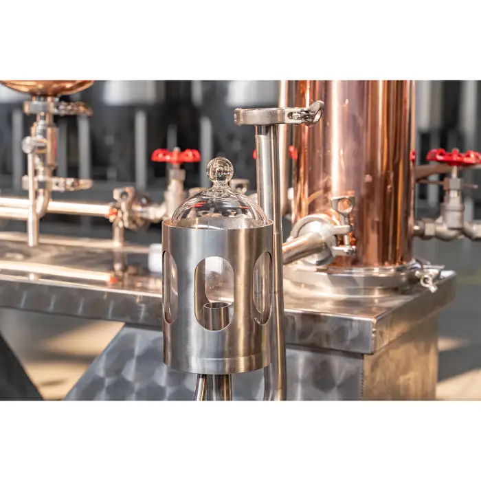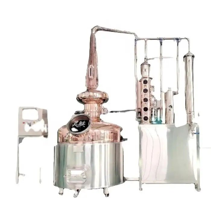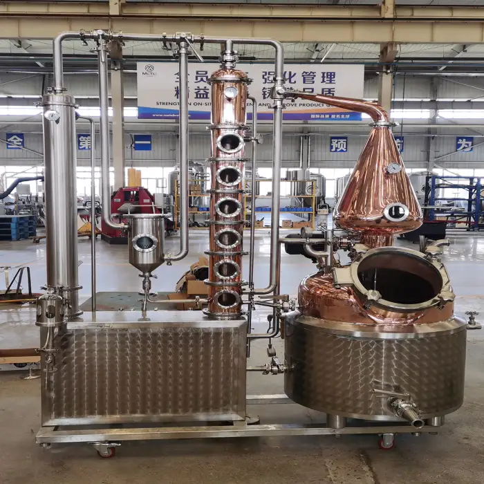 The distillation equipment is built with durable red copper and insulated with polyurethane for thermal efficiency. It also features stainless steel components for added durability.