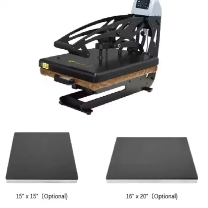 The Galaxy Auto Clam Heat Press Machine is available in two platen sizes: 15"x15" (381x381mm) and 16"x20" (406x508mm).