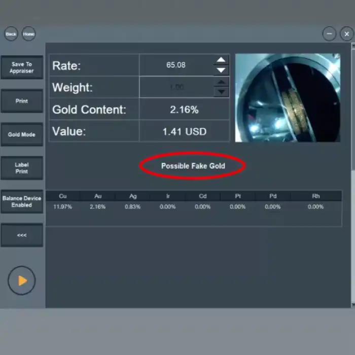 This machine can test a variety of metals, including gold (Au), silver (Ag), copper (Cu), platinum (Pt), palladium (Pd), and more.