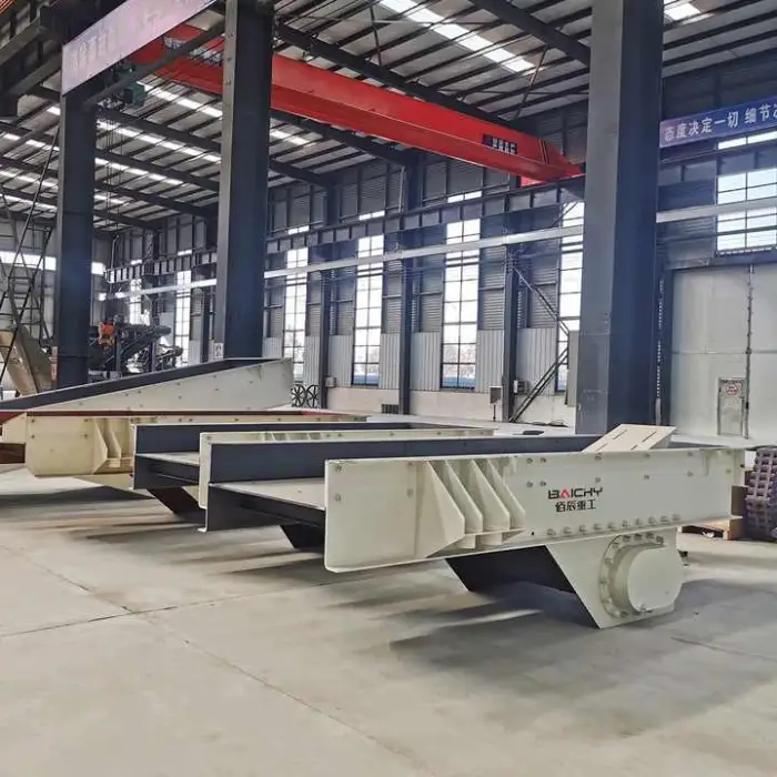 The vibrating feeder ensures even material distribution, which is crucial for consistent feeding into crushers or other machinery.