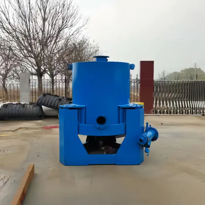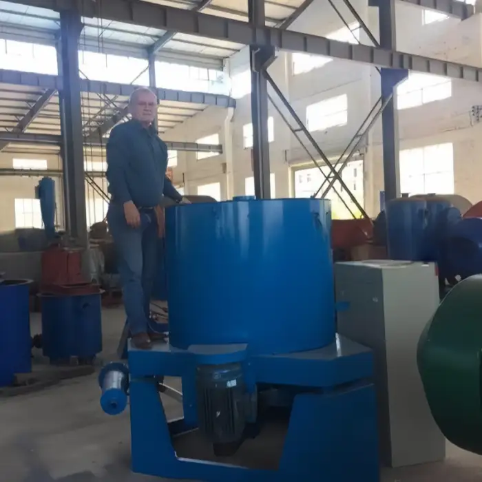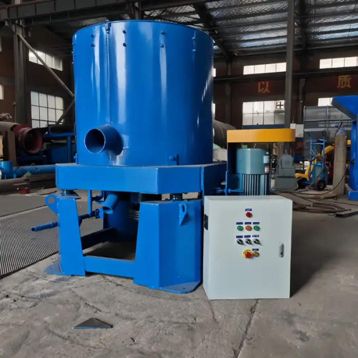 The machine uses centrifugal force to separate gold from other materials efficiently, making the mining process faster.