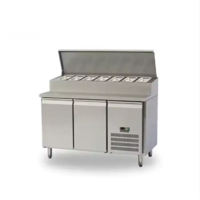 This unit is an undercounter commercial refrigerator worktable designed to keep drinks and ingredients cool while providing a durable stainless steel work surface for restaurants, cafes, bars, catering services, bakeries, food trucks and other commercial kitchens.