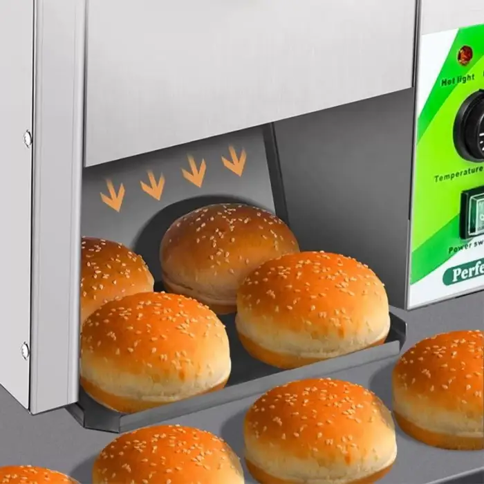 The Hamburger Making Machine features a conveyor chain design for fast and even toasting, which is ideal for high-volume use.