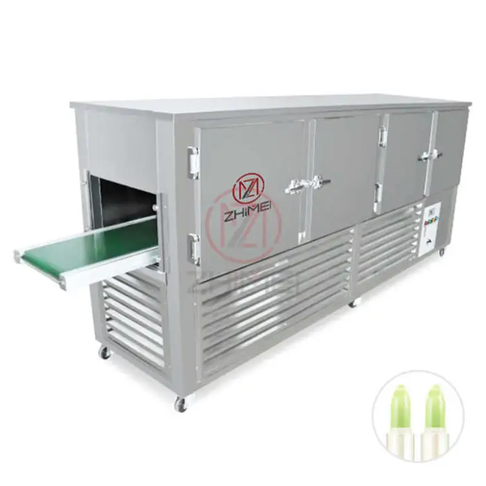 Freezing speed varies by product type, thickness, starting temperature, loading density and process settings. The machine offers high-efficiency rapid freezing, but exact freeze times should be determined by a product test or by reviewing the provided machinery test report.