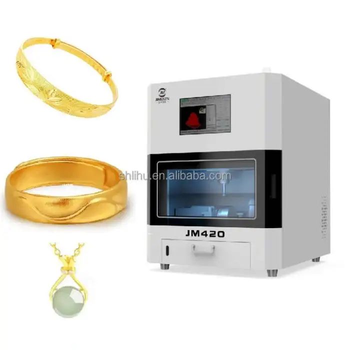 The machine is designed for engraving metal jewelry, particularly for creating intricate designs in beads, rings, and bracelets.