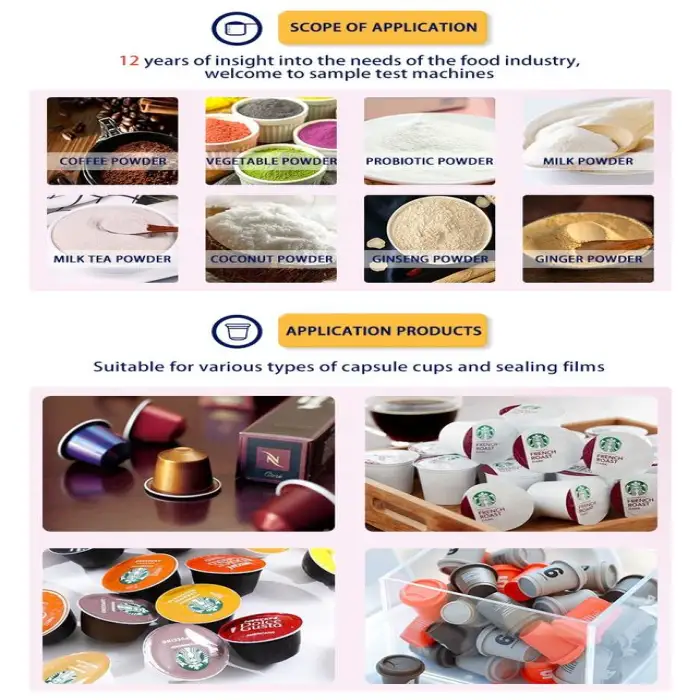 The machine is ideal for the beverage industry, food production facilities, dietary supplement companies, coffee capsule packaging, and pharmaceutical plants.