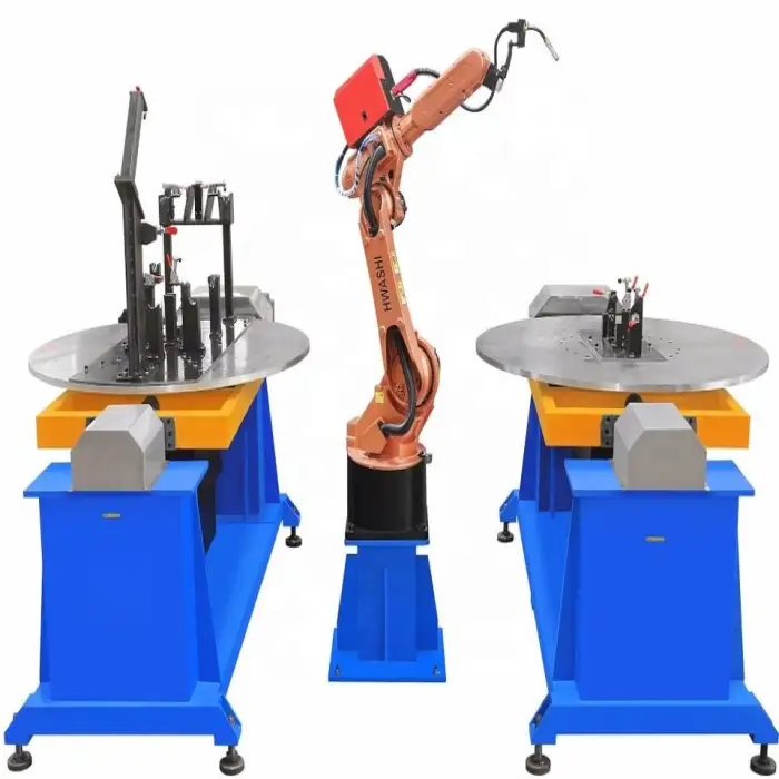 The Hwashi Six Axis MIG Welding Robot performs MIG (Metal Inert Gas) welding, which is suitable for various applications including household furniture and automobile parts.