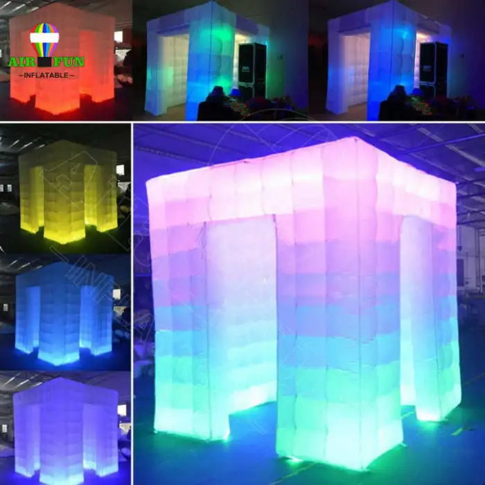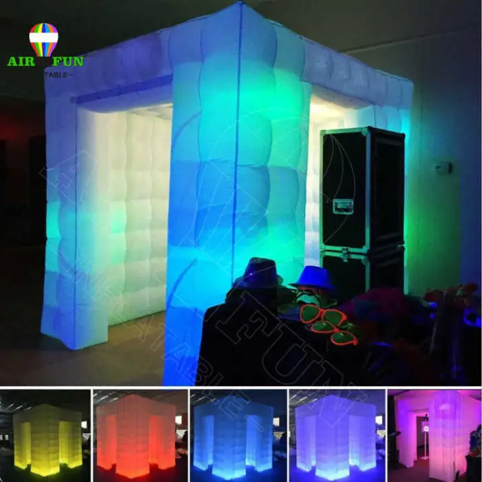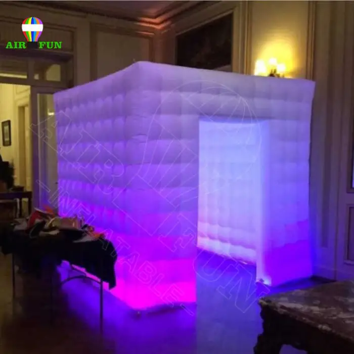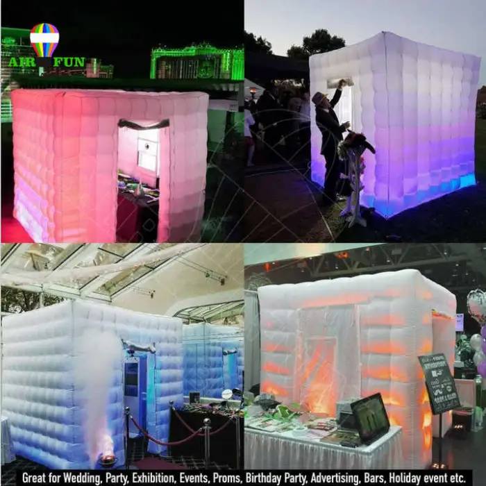 An inflatable cube-style photo booth tent designed for parties, events and promotions. It features LED lighting, is easy to set up, and can be customized for advertising and decoration purposes.