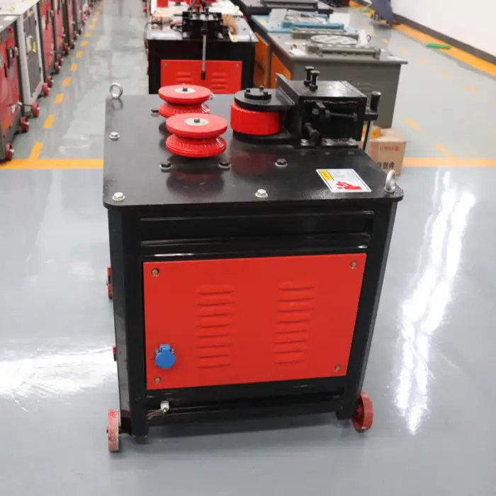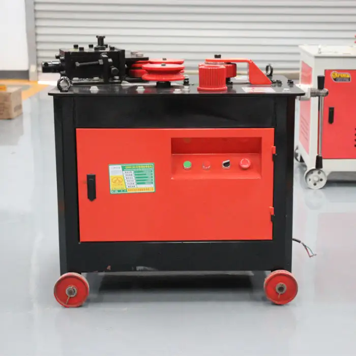 The machine is suitable for various steel bar sizes, specifically designed to work with carbon steel.