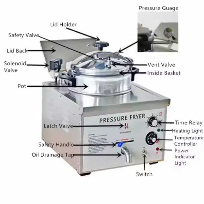 The product is described as a pressure fryer. Pressure frying requires following the manufacturer’s safety instructions carefully (secure lid, proper venting, release residual pressure before opening). Always read the user manual and follow local electrical and safety guidelines.